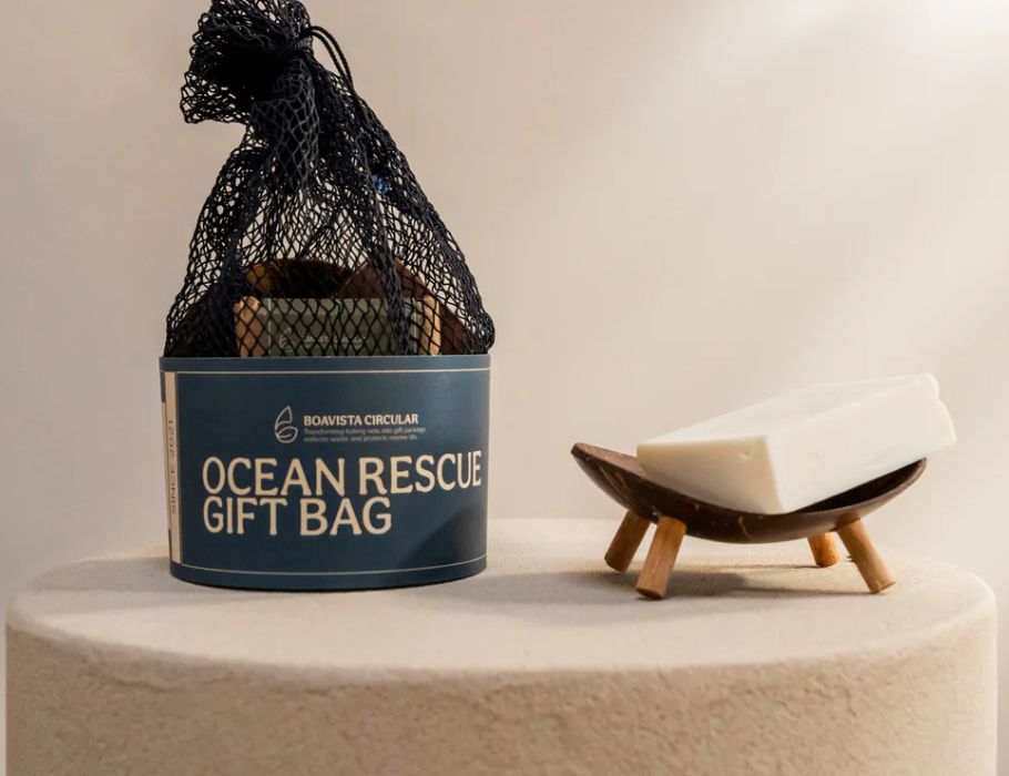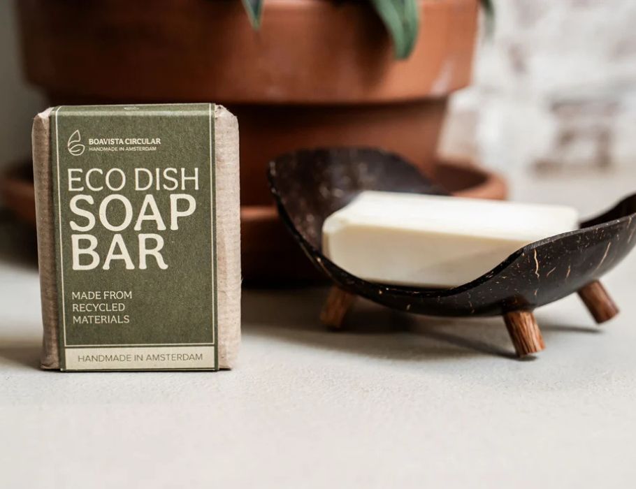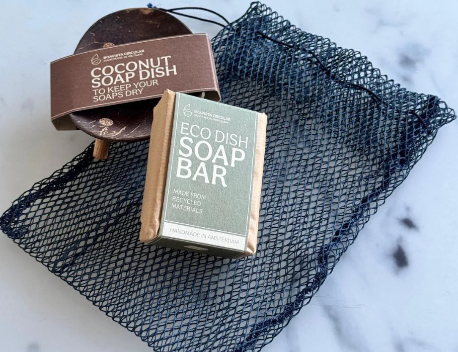 De producten zijn gemaakt van gerecyclede materialen. Zo worden kokosschalen vaak als afval beschouwd. Door er een zeepbakje van te maken, krijgt dit materiaal een nieuw leven! Het zakje is gemaakt van oude visnetten en de afwaszeep wordt gemaakt van gerecyclede frituurolie.