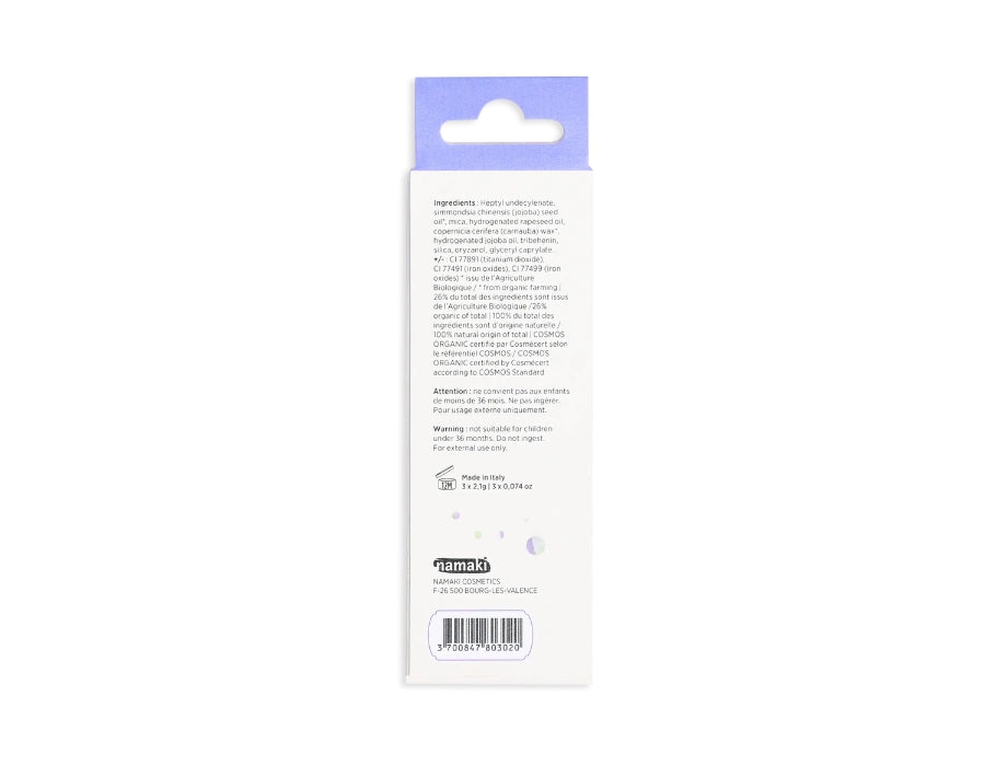 De glitterpotloden van Namaki zijn speciaal gemaakt voor kinderen, met gezonde ingrediënten waaronder biologische jojoba-olie. De make-up is Cosmos Organic gecertificeerd. Deze set van 3 potloden bevatten kleuren in het thema moonlight, met groen, paars en zilver.