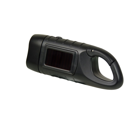 Zaklamp met LED verlichting op zonne-energie en dynamo. In het licht laadt de zaklamp op, zodat je ook in het donker licht hebt. Is de zaklamp niet voldoende opgeladen? Dan kun je hem zelf opladen door te draaien aan de hendel.